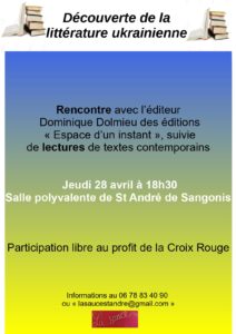 Ukraine affiche 4 jpeg par Malika Reungoat | Avr 13, 2022 | 0 commentaires Articles Récents 2026 : « Les Quatre Saisons des Léz’Arts »30 décembre 2025Novembre : le cœur battant de l’automne30 octobre 2025Des « coffrets d’art » dans les rues de Saint-André ?27 septembre 2025Soirée d’initiation au jeu de rôle sans maître du jeu !30 août 2025Vibrons ensemble le 14 juin !27 mai 2025 Poster le commentaire Annuler la réponseVotre adresse e-mail ne sera pas publiée. Les champs obligatoires sont indiqués avec *Commentaire * Nom * E-mail * Site web Résoudre : * 24 − 3 =