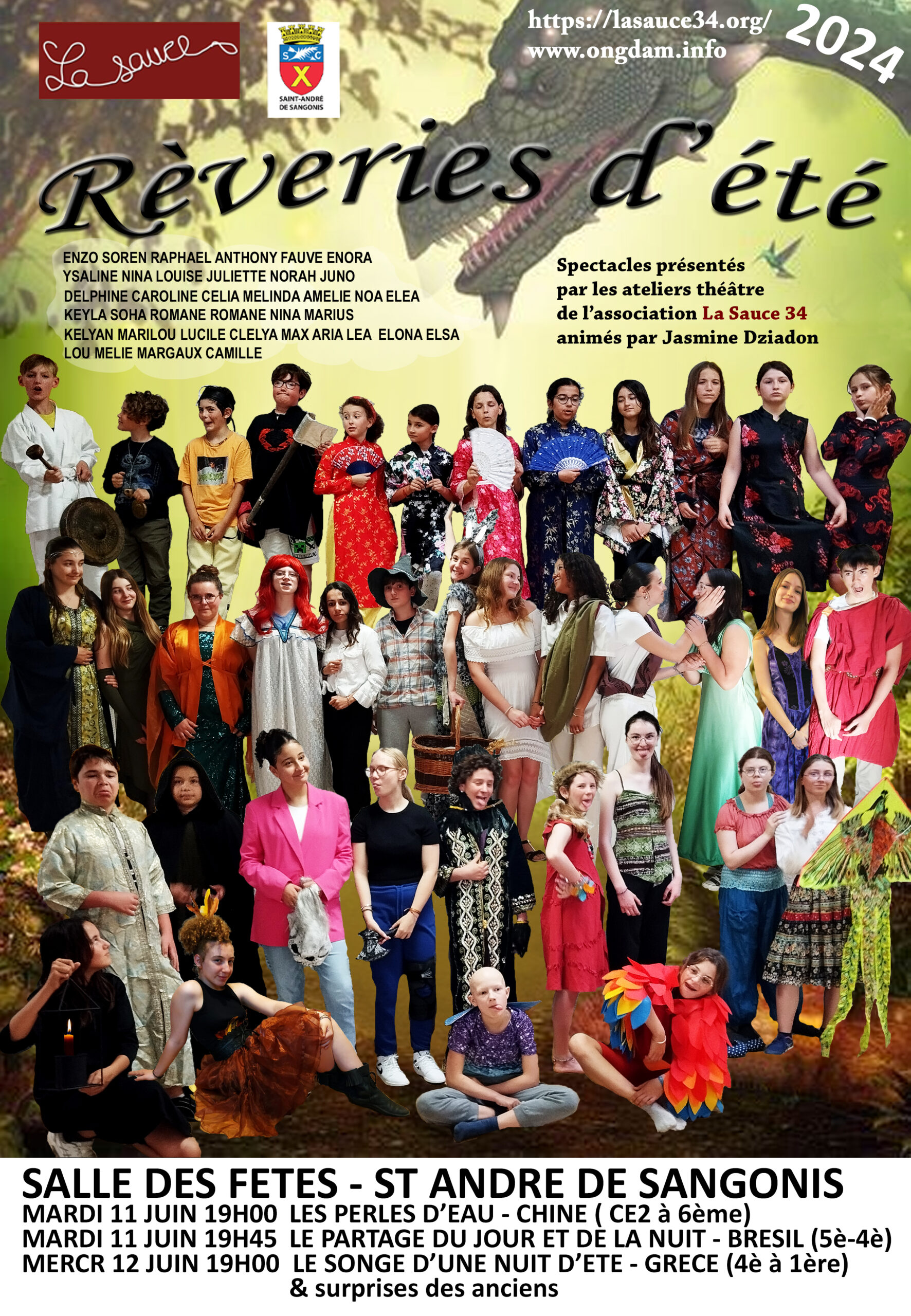 Cette année les ateliers théâtre de l’association La Sauce de Saint André de Sangonis, animés par Jasmine Dziadon, sont heureux de vous emmener en voyage à travers les songes et les légendes qui naissent des caprices des saisons et de la fantaisie des imaginaires à travers le monde.