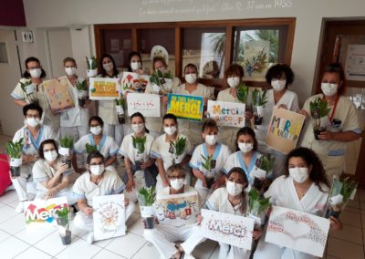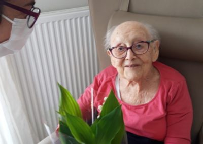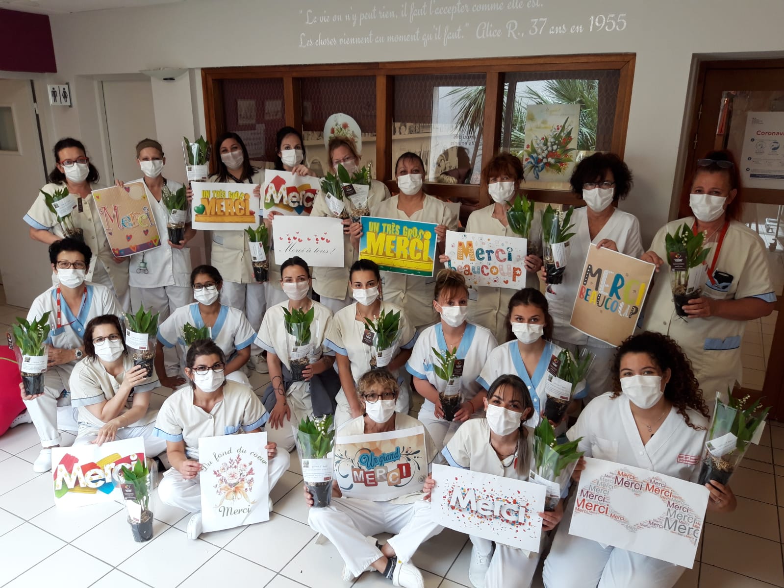 En trois jours, la cagnotte que nous avions ouverte a fait le plein (630 euros pour 120 pots !). Vendredi 1er mai, c’est un joli pot de muguet qui est arrivé dans chaque chambre, avec un petit mot de La Sauce, pour égayer les cœurs et porter un message d’affection à nos aînés qui souffrent de la solitude du confinement. Chaque membre du personnel en a également reçu un, en signe de notre reconnaissance pour leur merveilleuse et courageuse implication.